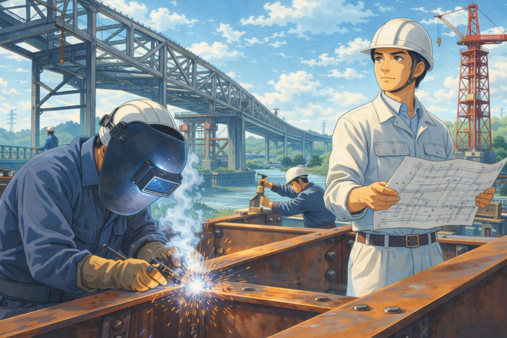 現場溶接・鉄骨製作・橋梁補修・保全など、各種鋼構造物に対応します。